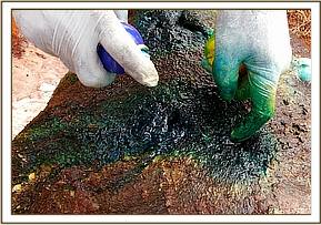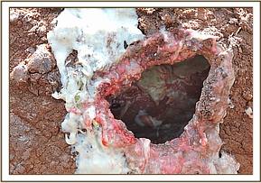 There was an arrow wound to the back near the spine with massive muscle destruction, pus and debris accumulation. The wound was probed and found to be deep. Dead tissues and pus were cleaned out using water mixed with Hydrogen peroxide. Tincture of iodine was applied and Oxytetracycline spray administered before a final cover of wetted green clay applied.