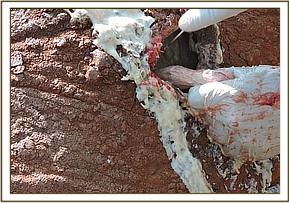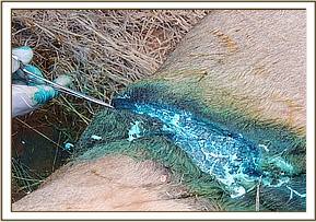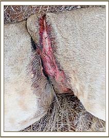 The resultant gaping wound cut through the skin and muscles but did not perforate the peritoneal cavity. The wounds were cleaned and sutured with about 20 interrupted nylon sutures with drainage gaps left open. Iodine was applied before the area was spray with Oxytetracycline. Green clay was used to cover the sutured area to aid in healing and keep dirt out of the wound. 15 cc of long acting Amoxicillin and Dexamethasone was administered parenterally.