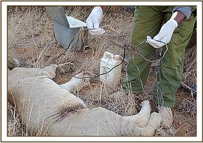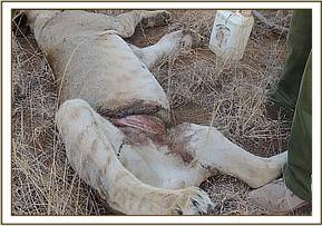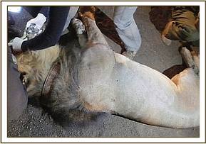 A dart containing 300 mgs of Ketamine and 4 mgs of Meditomidine was prepared to immobilize the lion. It took about 5 minutes for the lion to be fully immobilized and a vehicle was used to push the pride away. He was moved to a shady area and the tight snare around the abdominal area was removed.