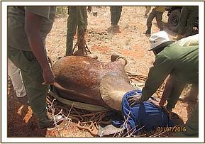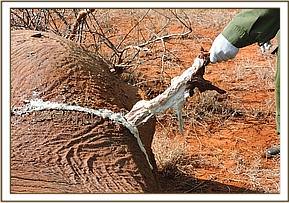The elephant was immobilized using 18 mgs of Etorphine in a dan-inject dart using the dan-inject system from the helicopter. He was darted in the rump and went down after 9 minutes.There was a penetrating wound on the back that had started to heal. The wound was enlarged and an arrow head retrieved from the injury.