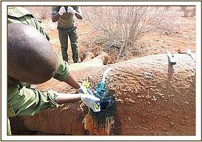 This elephant cow was spotted in Irima area of Tsavo East by visitors touring the area with a wound on the back with blood and pus oozing from it. They notified the vet team who rushed to the area to find the elephant with another elephant cow and two calves.