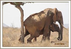An elephant cow was reported lame and struggling to walk near Sala gate by tour drivers visiting Tsavo East. The vet unit rushed to the area to find the lone cow with her 2 year old calf under a tree. The injured right rear leg was deformed and shorter than the left giving an obvious abnormal gait and motion. The right knee joint was bigger than normal but no wound was observed. The elephant could use the leg but with difficulty due to the deformity.