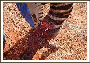 The last case was of a zebra foal on 24th June at Manyani area whose right fore leg was severely damaged around the coffin, pastern and fetlock joints by fire possibly sustained at a charcoal kiln. Charcoal burning is common in the area. Treatment of joint injuries is normally intensive and prolonged. In most cases, such injuries lead to severe infections and inflammation (arthritis) and the prognosis for recovery is always unfavourable. The foal was under severe pain and was unable to bear weight on this leg. The injury was severe and chances of recovery were nil. Thus, to stop further suffering it was humanely put down with 20% Pentobarbitone (Euthatal®) intravenously after immobilisation with Etorphine (M99®) combined with Xylazine (Chanazine®).