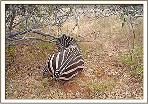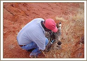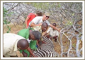 The first case was of a zebra mare with a wire snare on its neck at Kilalinda Lodge on 11th June. The lodge is a few kilometres from the Eastern boundary of Tsavo East. The snare was loose and had not inflicted any injury. Immobilisation was achieved by Etorphine (M99®) combined with xylazine (Chanazine®) administered by the Dan-inject dart rifle. Time to recumbency was about six minutes. The animal was given some long acting oxytetracycline (Oxykel® LA). It was revived with Diprenorphine (M5050®) and Atipamezole (Antisedan®) to antagonise the two immobilisation drugs respectively.