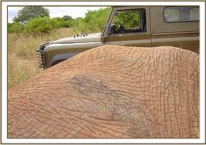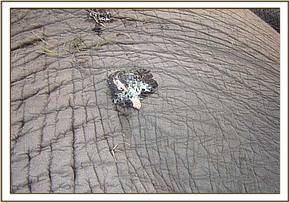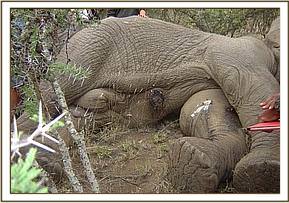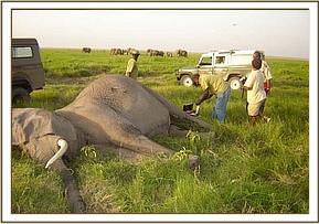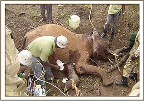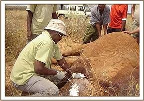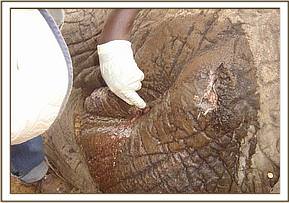 The bull said above was aged about 60 years old. It sustained serious injuries at the rear from another younger bull during a fight for a female on oestrus. A tusk went in on the left side on the rear and came out one foot above causing extensive muscle tearing internally. We were informed that it had bled heavily before we arrived to the extent that they thought we might find it already dead. We however found it alive but weak.