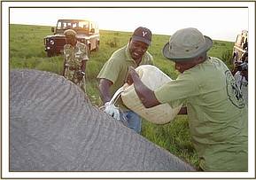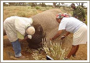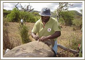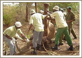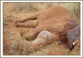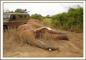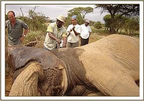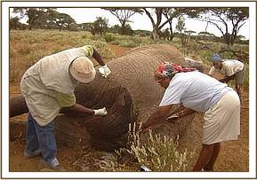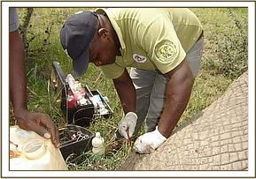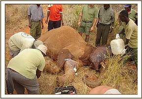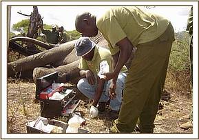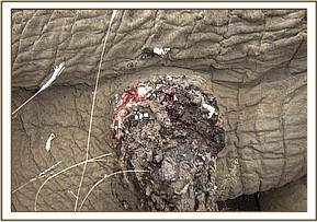 Tsavo Cases The first case in Tsavo was a bull aged about 40 years sighted at Kanderi (Tahri Camp) on the night of the 14th. It had two arrow injuries, one at the left chest area and the other on the lower right fore leg. The one on the chest was dry and uninfected but the one on the leg was infected and made the animal limp as it walked. We managed to track and find it the following day in the company of a family group about eight-km north of the camp along Voi River. We successfully immobilised and treated it. We have not been able to find it to assess the progress but that will be done in due course.