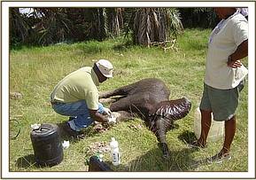 Nearby the same day, there was a bull aged about 40 years with serious multiple spear and arrow injuries all over the body.
