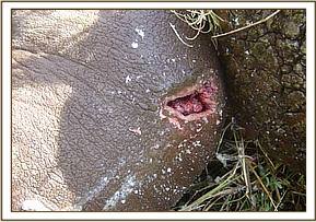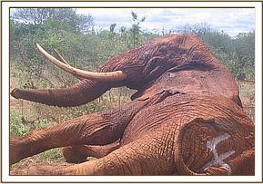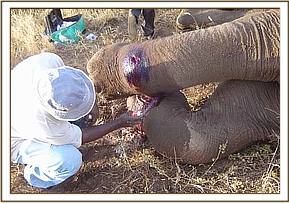 The other activity in the month was on the 6th of June while undertaking the above exercise, when we received a report of a bull elephant at Kabi ya Kazi on the western side of the Chyulu hills with a spear injury on the right fore leg. After confirmation that it was on sight, we rushed and treated it. The wound was very infected. We cleaned and treated it and administered high doses of a systemic antibiotic.