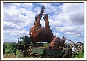 After the animal showed signs of narcotisation, the vehicles would close in slowly to enable fast response immediately it went down. Down time ranged between 4 and 12 minutes depending on the dart site and averaged about 7 minutes. Once down, the animal would be processed for recovery while the vets and the technician monitored its stability and took necessary samples. Overheated animals were cooled with copious amounts of water especially on the top ear pinna. Animals were recovered by a lifting crane and transported while still immobilised to the release sites where they were revived.
