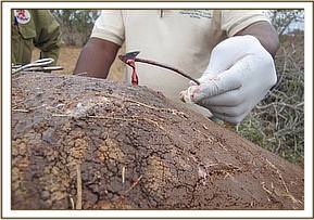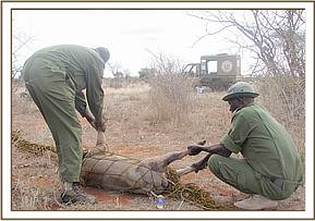 Dakota and Satao areas in southern Tsavo east are areas inhabited by elephant bulls with huge tusks. The elephants continue to be targeted by poachers for the trophies. The elephant bull was immobilized using 18 mgs of etorphine and had to be rolled over after it fell on the injured flank. A huge gaping hole on the left abdomen was cleaned using water mixed with hydrogen peroxide and a final coat of iodine splashed. Painkillers and antibiotics were also injected. Reversal was done using diprenorphine at 3 times the etorphine dose. Prognosis given was good.