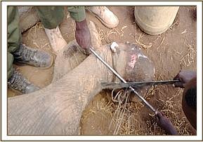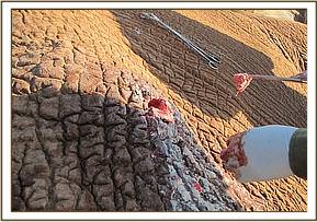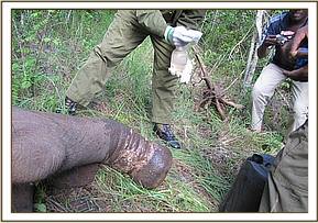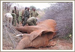 Treatment of an elephant bull with an arrow injury near Bachuma water hole, Tsavo east, 28th June.