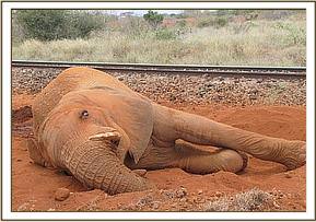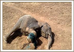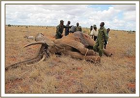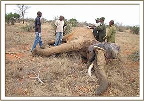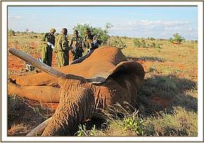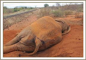 An elephant bull reportedly hit by a train was visited and found lying next to the railway line unable to stand up and struggling with great pain. Injuries were observed in the right hind leg and above the tail. The leg was examined and found to have complete fracture of femur and had a poor chances of healing. The elephant was euthanized and tusks removed and handed over to the security teams in the area. Cases of elephants being knocked down by trains continue to occur along Mombasa- Nairobi rail line that passes through the two Tsavo national parks.