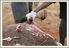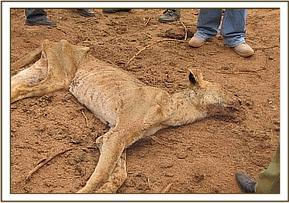 A thin lioness spotted near a water hole near sobo area of Tsavo east national park was visited and found already dead. The carcass was taken to the vet labs in voi and an autopsy carried out. The body condition put at a scale of 1/5 was so thin the skeletal system was pronounced. Internal injuries with haemorrhages pointed to possible elephant attack and starvation due to old age. Tissue, tick and internal parasite samples were taken and preserved for further analysis.