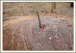 An elephant bull was reported by tourists near Bachuma water hole with an arrow head protruding by the body side. He was swiftly spotted and immobilized using 18 mgs of etorphine propelled from a dan inject dart system. A sharp arrow head was pulled out of the right abdominal side, wounds cleaned with hydrogen peroxide/water mixture, iodine applied and covered in green clay. Long acting antibiotics and dexamethasone was also injected. Prognosis is good.