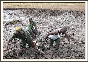 The zebra foal was spotted stranded in a muddy water hole along the pipeline road within Tsavo east national Park. A team rushed into the muddy waterhole to retrieve the half way submerged foal but found it already dead. The zebra suffocated after its nostrils were submerged in mud.