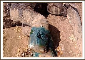 An elephant bull reported lame between Kutima and lualenyi ranch was visited and found struggling to walk near a water hole. The mid aged bull was immobilized using 16 mgs of etorphine and went down in 6 minutes. He was rolled over by use of ropes tied on the vet unit vehicle. The left hind limb that appeared lame was examined and diagnosed to have a sprain at the knee joint making movement a painful experience. Long acting antibiotics and anti-inflammatory drugs were administered and the elephant revived using diprenorphine at 3 times the etorphine dose. He was assisted to stand up after it was unable to stand and a guarded prognosis given.