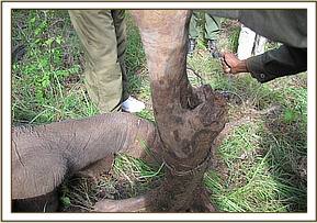 Shimba hills national reserve is a coastal rain forest with many elephants inhabiting the area. A case of young snared elephant bull was reported in the reserve. The elephant was found dragging a small tree chained on the right front limp by a wire snare and moved with great pain. He was darted using 16 mgs of etorphine in a dan inject dart gun. The wire snare attached to the twig was set free and the wounds cleaned using water mixed with hydrogen peroxide and then splashed with iodine. Injections of long acting antibiotics and anti-inflammatory drugs were made. Prognosis is good.
