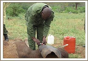 This partially independent elephant orphan was escorted back to the stockade by two former orphans with a deep penetrating wound to the rib cage and another near the spinal ridge. The vet team was airlifted to Ithumba by the DSWT pilot and found the elephant restrained in a boma.