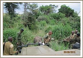 A report was made to the unit by rangers from Taita salt lick sanctuary team of a lame buffalo near the hotel compound. The team rushed in to find the massive bull lying down in tall grass.