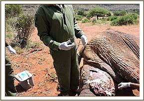 She was administered with 3 mgs Etorphine IV then injected Dexamethasone and Catasol intramuscularly and long acting antibiotics. Anesthesia was reversed and ropes tied to a vehicle used to assist her onto her feet. She could only make it to a sitting position and could not rise even with assistance. After several attempts it was obvious she was old and too thin to stand up and a decision was made to euthanize to end her pain. The tusks were removed and handed to KWS security in Tsavo east for safe keeping.