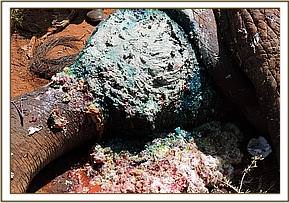The wounds were attempted to be cleaned before immobilization but the orphan became aggressive and had to be immobilized using 4 mgs of Eetorphine Hcl. The infected wound was washed with water mixed with Hydrogen peroxide. Tincture of iodine and Oxytetracycline spray were applied to the wound before it was covered with green clay. Long acting antibiotics and anti-inflammatory drugs were administered parenterally.