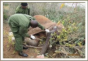 She was administered with 3 mgs Etorphine IV then injected Dexamethasone intramuscularly. Ropes were tied to a vehicle to assist her to her feet. However she was unable to stand and after several attempts it was obvious she was too old to stand up.