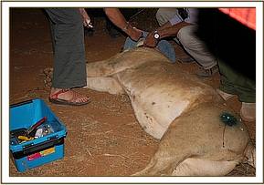 On close examination intestinal tympany/ bloat was diagnosed. Attempts to relieve the bloat proved difficult as the Hippo could not ingest any drugs critical in resolving the problem. Liquid paraffin was administered per recta and flunixine meglumine and long acting antibiotics administered parenterally.