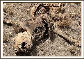 The carcasses were in an advanced state of decomposition and signs of predation evident. The two lion carcasses and one hyena carcass were lying not more than 50 metres apart with an old eaten Bovine carcass nearby. There was a cattle boma about 500 meters from the site of the deaths.