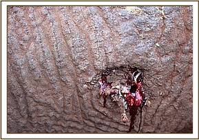 The carcass was lying on the right flank with no injuries on the left exposed side. However, ventral oedema was seen on the lower abdomen and the carcass was in poor condition. The carcass was rolled over to expose the right flank and there was a penetrating wound to the right chest area with pus oozing out. The penetrating chest wound went deep into the right lung area with massive suppurative inflammation of the right lung. An arrow head was recovered among the dead pulmonary tissues. Cause of death was by arrow shot with accompanying infection.
