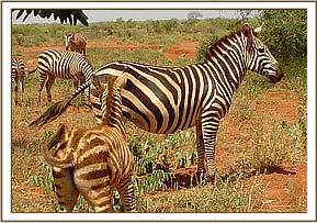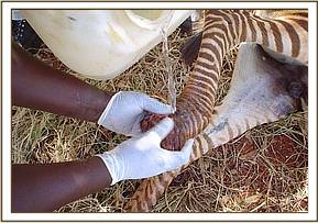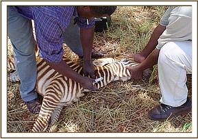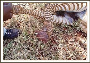 An injured Zebra Foal at Manyani Gate The foal aged about 2 months was seen on 3rd March limping with the right hind leg. Close observation revealed that the hooves had been taken out by an unclear cause, but could possibly be a snare. It could still bear some weight on this leg. It was immobilised for close observation and treatment. The wound was not infected. It was cleaned and treated topically, and a systemic antibiotic of long acting amoxycillin was given.
