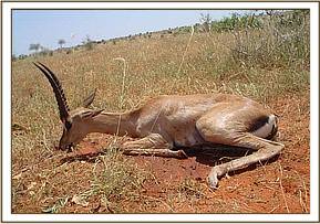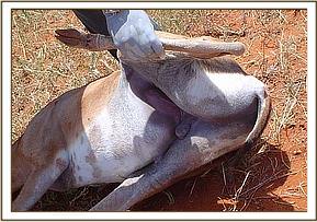 Grants Gazelle with Mange at Dika Plains The gazelle was sighted at Dika plains with severe mange. Two other gazelles with the same disease were treated at Sala gate in January. This particular gazelle was immobilised with a mixture of M99® and xylazine hydrochloride and treated with Ivermectin (Ivomec®) subcutaneously. It was also given some long acting amoxycillin (Betamox®) and revived with M5050® and Antisedan®.