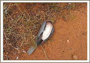 The reports of deaths of birds at Manyani were received from the KWS training school on the 23rd March. The other area that was said to be affected was the Oil Pipeline pump station. The numbers involved were not many but the incident was reported for further investigation to rule out any disease. The species involved were laughing doves, weaverbirds and cattle egrets. When we visited the two areas, we were informed that the problem started about two weeks before but no deaths had been observed in the previous two days. We searched the two areas for any fresh carcases or sick birds that we could sacrifice for samples but found none. We saw six dead birds (2 weavers, 4 doves) all of which were more than 48 hours since death..