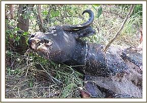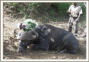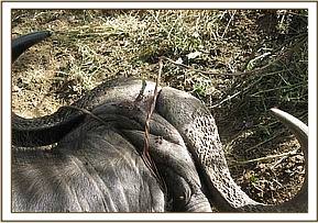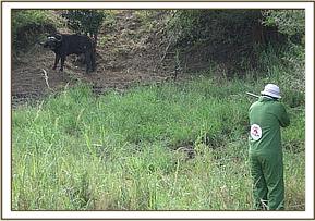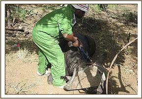 Luarenyi ranch has abundant wildlife but the primary activity is livestock keeping. Part of it is leased to Lumo sanctuary for eco-tourism activities. The management of Luarenyi camp, located within the ranch, reported the buffalo, which was still tied by the snare to a bush on 8thMarch. We responded immediately and found the buffalo still struggling to release itself from the snare.