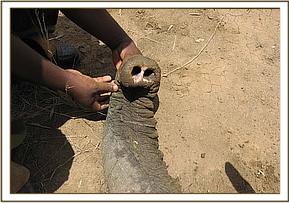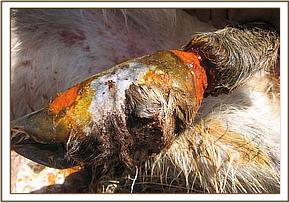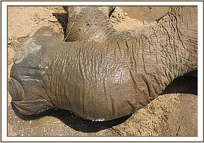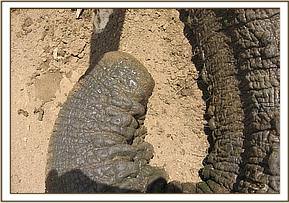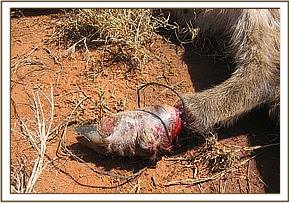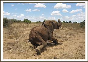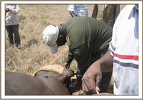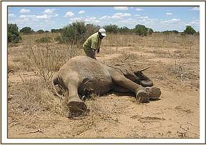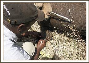 The other clinical case was at Satao in Tsavo East, this time a seven year old male elephant. It was reported to us as limping but the cause could not be established. We could also not establish the cause from a distance because of terrain and thick vegetation cover which could not allow approach to within a good distance for observation. We therefore decided to immobilise it for further examination, diagnosis and treatment. Darting was done on foot because of reasons stated above (bad terrain and thick vegetation cover). Examination after immobilisation revealed a swollen and stiff right fetlock joint but there was no external opening. The animal might have sustained an injury long time ago which healed abnormally. As it walks it is able to bear weight on the leg and there are no signs of pain.