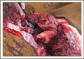 After saving the massive bull the vet team encountered a dead elephant calf that appeared thin. Post mortem examination revealed deep penetrating wounds on various parts of the body suspected to be due to lion predation attempts. Death was from bacterial septicaemia.