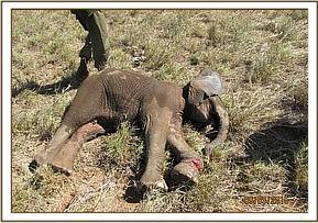 The mother elephant was immobilised with 16mg Etorphine Hcl, in a 1.5 ml Dan - inject dart administered from a vehicle using a dart gun. After the she went down the calf ran off but was easily captured and immobilized using 2 mgs of Etorphine administered by hand.