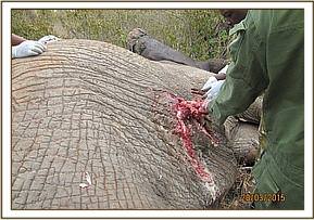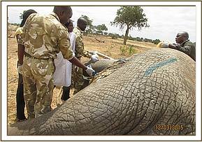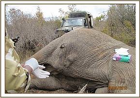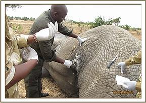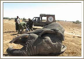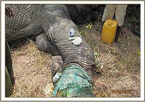 This elephant was immobilised using 18mg Etorphine in a 3 ml Dan - inject dart from a vehicle using a Dan inject dart rifle. The elephant was darted near a water hole and was immobilized after 8 minutes. He fell on the lateral side and the team went into action with the rangers pouring water on the ears while the vet undertook the examination.