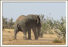 This elephant was immobilised using 18mg Etorphine in a 3 ml Dan - inject dart from a vehicle using a Dan inject dart rifle. The elephant was darted near a water hole and was immobilized after 10 minutes. Aircraft support was requested as the elephant briefly vanished into thick bush in the area. The elephant was spotted and fell on lateral recumbency.