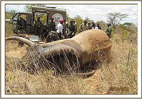 This elephant was immobilised using 18mg Etorphine in a 3 ml Dan - inject dart from a vehicle using a Dan inject dart rifle. The elephant was darted near Voi river and was immobilized after 8 minutes. The elephant fell on the lateral side with the wound on the upper side and the team went into action.