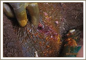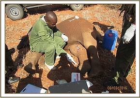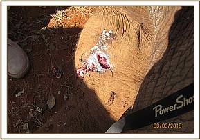 There was swelling and penetrating wound that went through the right knee joint with pus oozing from the wound most likely caused by a bullet. The elephant could hardly place weight on the leg. The necrotic tissues were cut off and the pus washed out by lavaging with normal saline mixed with antiseptics.