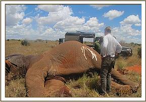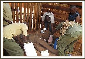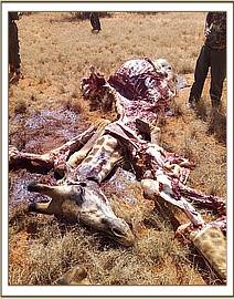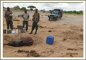 After the treatment of the injured calf the team received a report of a giraffe carcass spotted nearby by a pilot. The team went to confirm the cause of death on the fresh Giraffe carcass. Autopsy revealed killing and extraction of the flesh while the skin, skeletal tissue and intestinal contents were left.