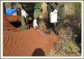 This elephant bull was spotted near a watering point in Dakota area by KWS rangers from the Dakota platoon with wounds to the flank with pus oozing from them. They notified the vet team who immediately rushed to the area to find the injured bull near the water hole.