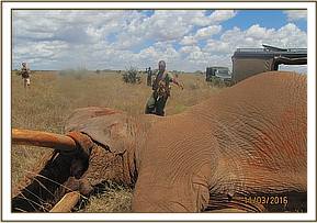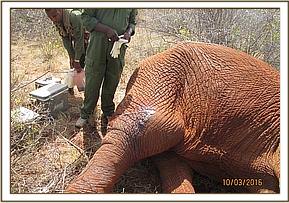 The elephant was immobilized with 18 mgs of Etorphine in a dan-inject dart. A vehicle was used to trail the bull who had moved away after seeing the vet vehicles. He was darted in the rump and kept in grassland by the vehicle until he went down after 11 minutes.
