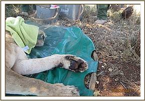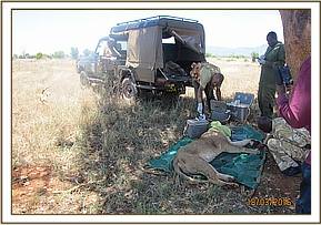 The alpha 2 agonist was reversed using Atipemazole Hcl after one a half hours and guarded until she had fully recovered and let to join her pride.