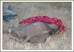 The anesthetic was reversed by administration of Diprenorphine Hcl at three times the Etorphine dose and both mother and calf woke up together and walked away calmly. Prognosis is good.