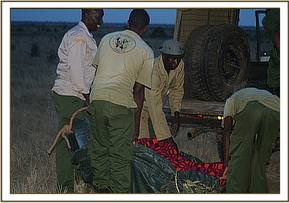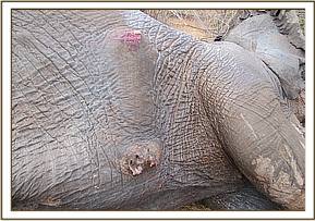 The carcass was male, fresh and lying on the right flank. The tusks were recovered by KWS rangers. There was a penetrating wound at the top of the neck and the chest which were still oozing blood and pus. and exited at the right chest area. Ventral oedema was evident on the chest and abdominal area.