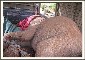 A report was made by tour operators of an elephant calf that was abandoned near Satao, Tsavo East. The vet team together with the Voi stockade team rushed to the area to find the young elephant alone and pacing the area. The calf had lost condition and had an injury to the left hind leg. He was quickly captured and taken to the Voi Stockade whilst a rescue plane was organized to take him to the Nairobi Nursery.