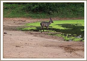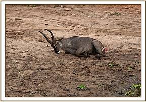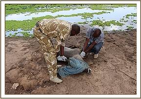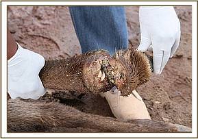 The waterbuck was immobilised with 6 mgs of Etorphine Hcl mixed with 40 mgs of Xylazine and went down in 4 minutes. Examination revealed an extensive deep cut on the fetlock joint by the tough wire snare that nearly severed the hoof. The joint was completely damaged with skin, ligaments and synovial cavity all damaged exposing the distal condyle of tibia. The injury was given poor prognosis hence the waterbuck was euthanized by administration of 20 CC of euthanaze (20% Pentobarbitone Sodium) by rapid IV injection through the jugular vein.