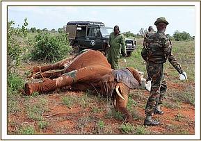 A report was made by tour drivers regarding a lone elephant cow in Bachuma area of Tsavo East National Park foraging alone with no other herd nearby and showing signs of lameness while walking. The unit drove to the area from their base at park headquarters near Voi to find the lone cow busy feeding.