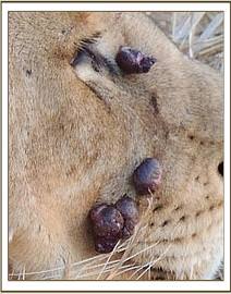 The resident lions at Taita Sarova Sanctuary have been spotted several times by both tourists and local rangers with growths around the face that appear abnormal. The Vet was called in to examine the growths and to see whether they are transmissible. The team visited the Conservancy and after a thorough search the lions were found near Riverine vegetation. Visual examination by use of binoculars revealed abnormal growths around the whiskers.